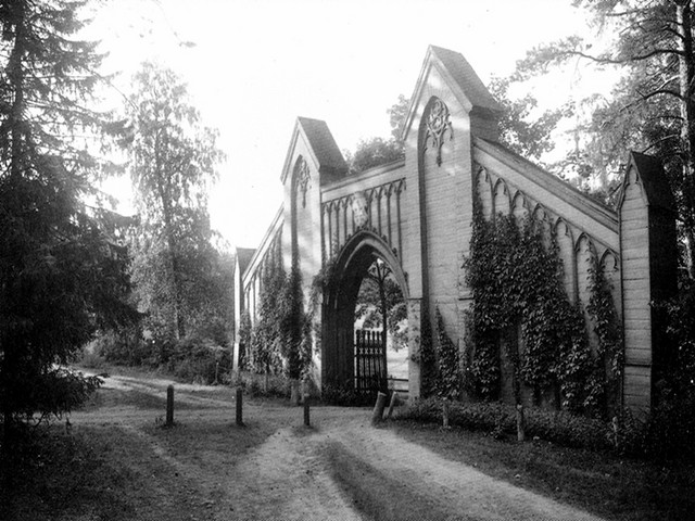 А между тем, вероятно, далеко не все из посетителей знают, что ворота, подобные тем, что украшают вход в Монрепо, есть и в других местах. Достаточно назвать подмосковную усадьбу Дубровицы или усадьбу Тайцы недалеко от Петербурга. У них есть одна общая черта: они выполнены в так называемом неоготическом стиле, который процветал в Европе на протяжении XIX века и воспринимался его создателями как творческое продолжение традиций великой средневековой готики. Ворота в парке Монрепо также принадлежат к неоготике, и их сооружение относится к середине 1830-х годов. Но у них есть и существенное отличие от усадебных ворот в окрестностях обеих столиц. Наши ворота - деревянные, а “деревянная неоготика” - это не слишком обычное явление, тем более что камня и в парке, и вокруг него предостаточно.