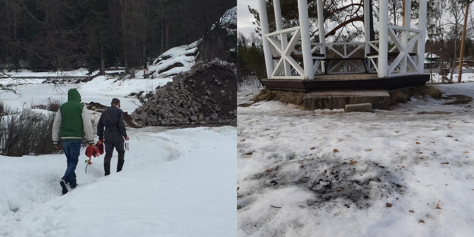 Итак, на днях двое молодых людей развели костер на скале в полутора метрах от Чайной беседки. Туда их доставило такси, номер которого записал охранник; машина проехала на территорию через открытый для рабочей техники шлагбаум.
