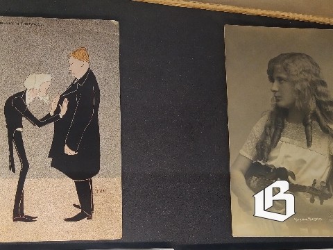 - Открытка «Александр Глазунов и Направник» явно отсылает зрителя к рассказу Чехова «Толстый и тонкий». Фотопортрет и известной Цецилии Ганзен подчеркивает её очарование.