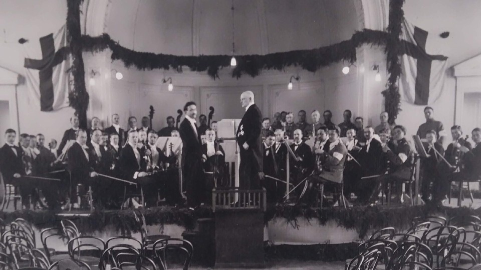 Поскольку в выборгском оркестре было недостаточно оркестрантов, чтобы играть музыку Сибелиуса, пришлось приглашать их со стороны. Фотограф запечатлел Сибелиуса за пультом на сцене Центральной Народной Школы, нынешнего Выборгского дворца культуры, а рядом с ним легендарная для Выборга личность – директор музыкального училища Борис Сирпо, человек, много сделавший для развития выборгского музыкального образования.