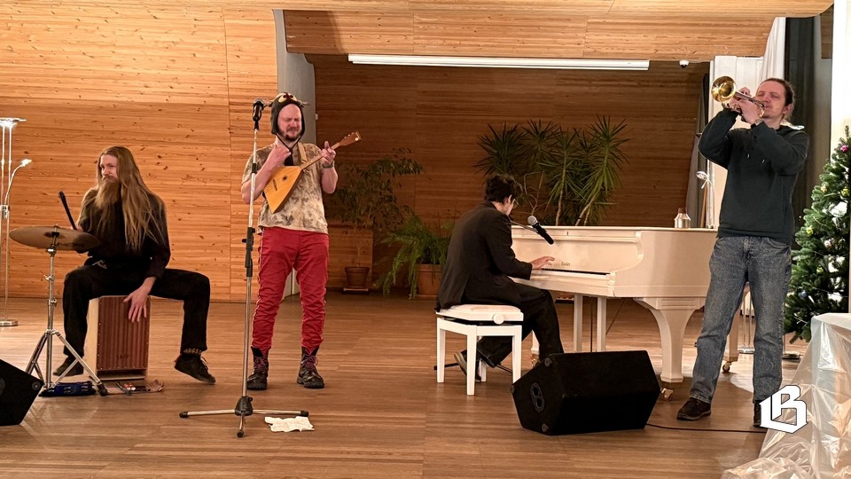 Логичным развитием творческого перформанса стал концерт. Несмотря на то, что в полном составе петербургская группа «Улицы декабристов» представляет собой внушительный коллектив из десяти исполнителей, для камерной атмосферы выборгской библиотеки был выбран формат квартета. Со Стасом приехали: трубач Алексей ГОРШКОВ, перкуссионист Денис ФИНЬКО и пианист Максим АЛЁШИН.
