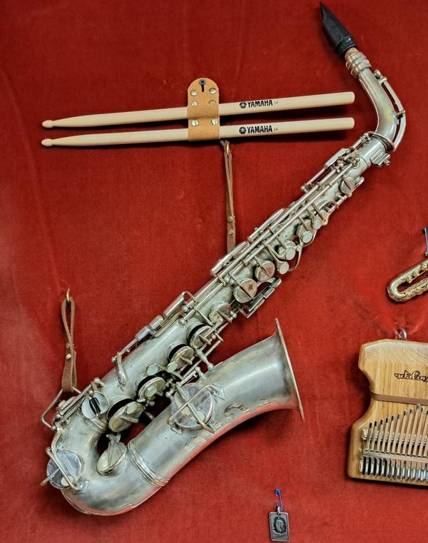 Например, саксофон антикварный инструмент, подаренный Виниловому бункеру нашим постоянным гостем, коллекционером антиквариата. Судя по гравировке саксофон был произведён в немецком городе Маркнойкирхене, а продавался он фирмой Йоханнеса Адлера. Вероятно, саксофон был сделан в начале 20 века, а может и в конце 19. И возможно произведён он был в мастерской легендарного Макса Кейлверта. Но это моя догадка и точный ответ могут дать только специалисты. Но в любом случае этот инструмент - украшение интерьера Винилового бункера.