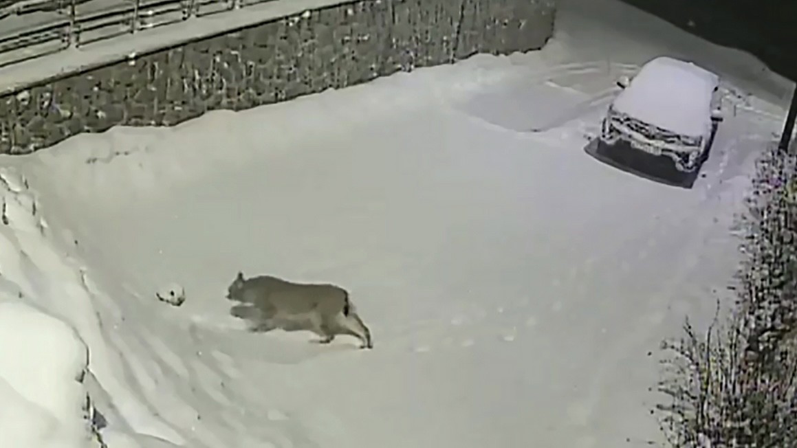 Камеры видеонаблюдения запечатлели дикую рысь, прогуливающуюся по территории.