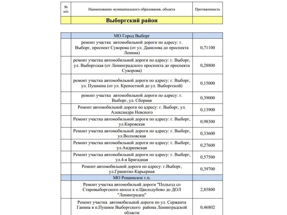 Список ремонтируемых дорог в Выборге и Выборгском районе: