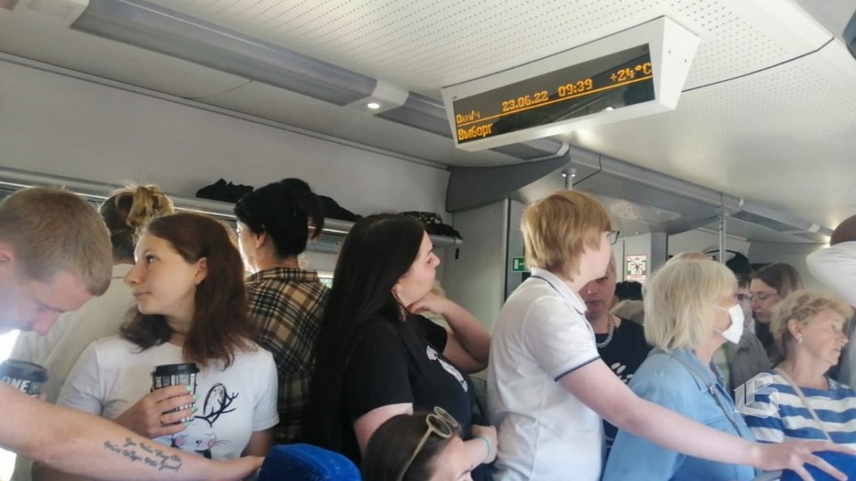 Все сидячие места были заняты пассажирами почти мгновенно (напомним, в типовом вагоне 97 мест). Сегодня состав подан под посадку в 9.00, а через 2 (!) минуты все уже было занято. Остальные люди всех возрастов, с семьями, детьми и собаками, пришедшие к дверям поезда позже, остались стоять.