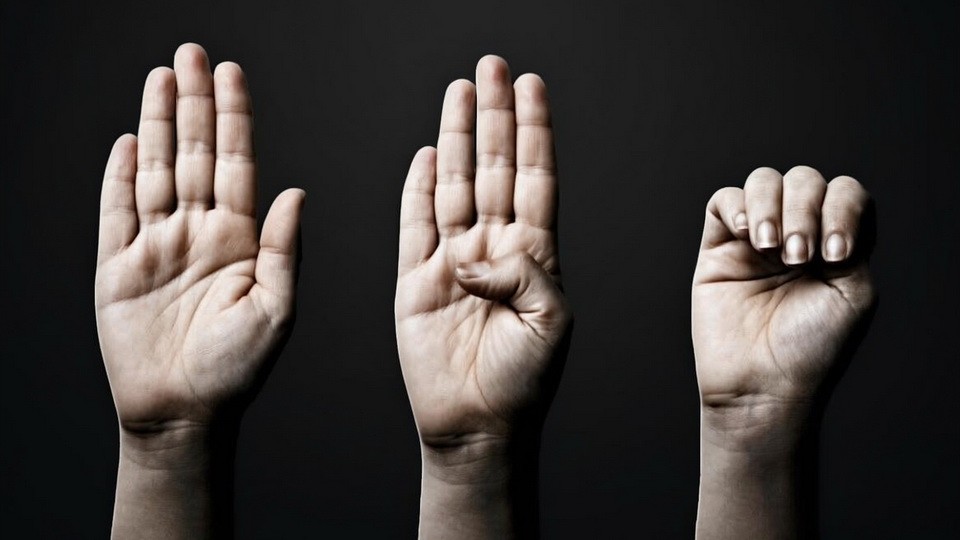 Жест представляет из себя раскрытую ладонь с прижатыми друг к другу четырьмя пальцами, а большой палец прижат к ладони.