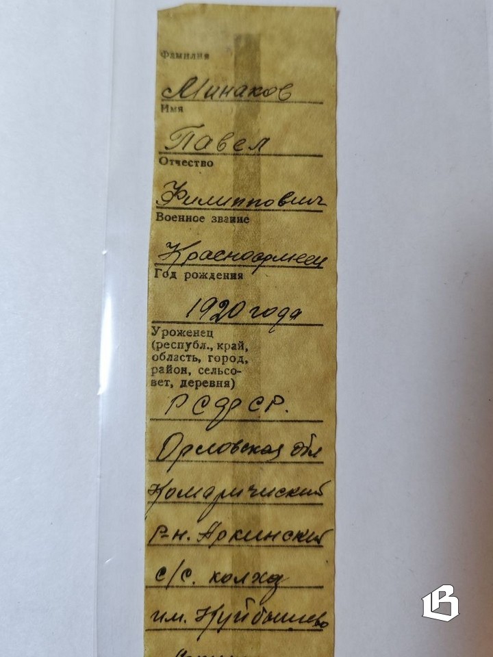 – Медальон был законсервирован и передан для вскрытия командиру поискового отряда «Северный рубеж» Владимиру ОВЧИННИКОВУ, имеющему необходимый опыт, – рассказывает командир поискового отряда Ольга БОГДАНОВА. – По характерной зеленой полосе на вкладыше стало понятно, что он принадлежит пограничнику, а именно – Павлу Филипповичу Минакову, красноармейцу 103-го погранотряда, 1920 года рождения, уроженцу деревни Аркино, что в Комаричском районе Орловской области. Имена остальных бойцов, к сожалению, установить не удалось.