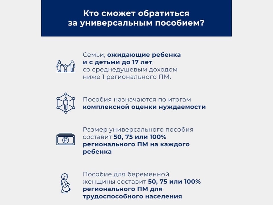 Универсальное пособие будет предоставляться семьям с доходами ниже одного прожиточного минимума на человека с применением комплексной оценки нуждаемости. Размер пособия составит 50, 75 или 100% от размера прожиточного минимума, установленного в регионе. Сообщается, что в среднем по стране в 2023 году это составит 7 тысяч, 10,5 тысяч и 14 тысяч рублей.
