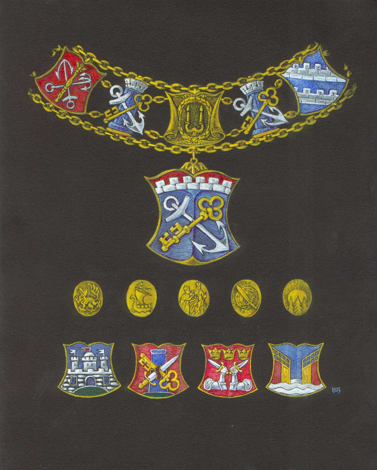 Это та самая впечатляющая цепь, украшавшая грудь Александра ДРОЗДЕНКО во время вступления им в должность. Утвердили её ещё в 2003 году. Разглядеть должностную регалию вблизи дано немногим. Как рассказал наш собеседник, член профильной комиссии Геральдического совета при Президенте РФ Михаил Медведев, это не просто украшение: каждый элемент в нём исполнен смысла. Центральная подвеска – герб Ленинградской области – дополнена пятью историческими гербами, в разные эпохи обозначавшими регион или его части. Наш город и тут отличился: шестой герб был сочинён специально для цепи, соединяет городские мотивы с территориальными и указывает на Выборг и окружающие его карельские земли. Шесть картушей той же цепи рассказывают о вехах истории региона. Здесь двухсвечник как геральдическая интерпретация старейшего знака Рюриковичей, «лютый зверь» – древний символ Новгородской республики, ладья, напоминающая, что наша земля лежала на пути из варяг в греки, персональная эмблема Петра Великого в виде царя-скульптора, высекающего своё царство из скалы, щит и меч, напоминающие о боевых подвигах, и встающее над лесом солнце как образ постоянного обновления. Романтично и захватывающе, не правда ли?