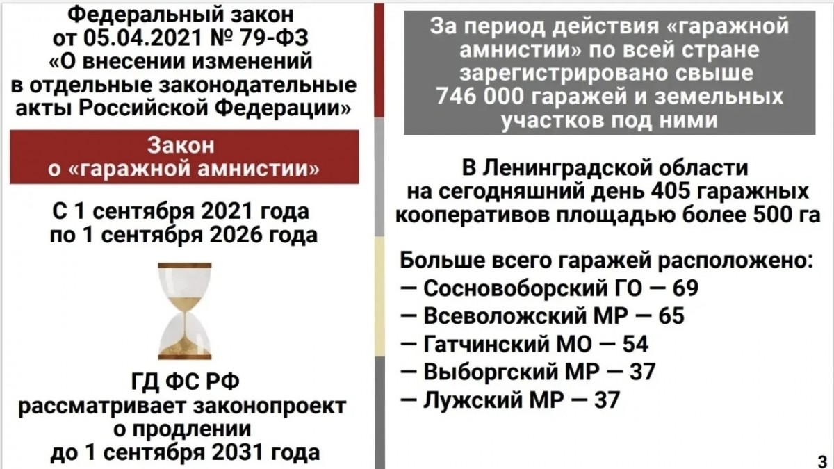 С 2021 года, когда стартовала программа, было подано более 21 300 заявлений на оформление гаражей. Лидерами по количеству обращений стали Всеволожский, Гатчинский районы и Сосновоборский округ.