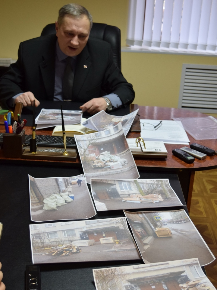 Игорь Дёмкин продемонстрировал журналистам фотографии, наглядно характеризующие небрежность рабочих, которые непосредственно занимаются монтажом. Распотрошенные пустые ящики лежат на улице, загромождают проход. На Леншоссе, на Большой каменной мы наблюдаем такую неприглядную картину. И это все происходит в центре города.